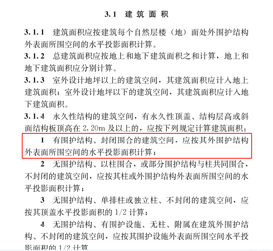 新规规定:有围护结构、封闭围合的建筑空间,应按其**结构外表面所围空间的水平投影面积计算;无围护、单排柱或独 立柱、不封闭的建筑空间,应按其顶盖水平投影面积的1/2计算。