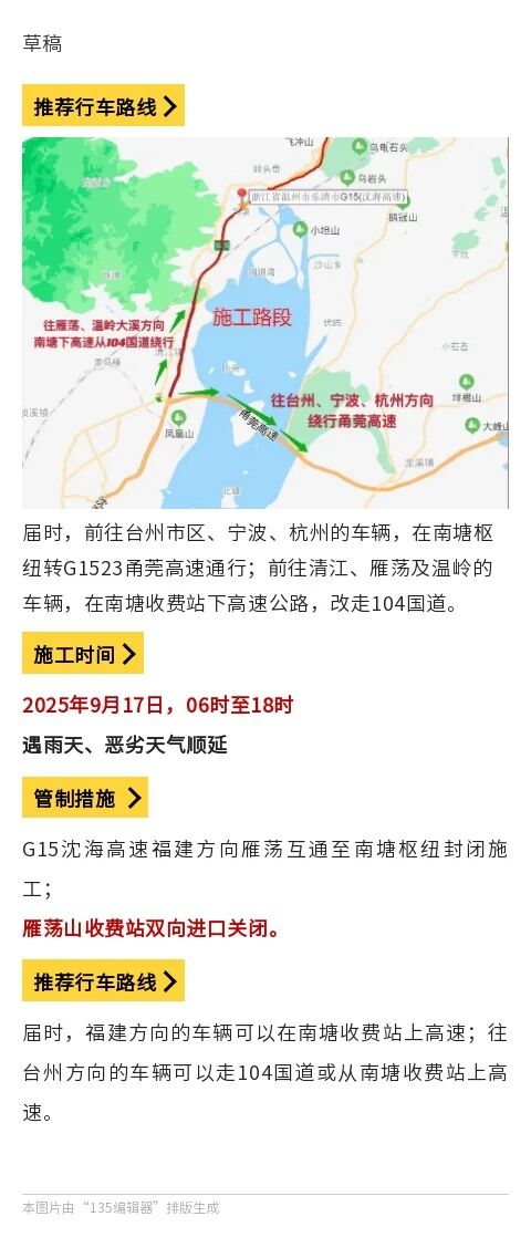 南塘、雁荡山收费站往G15沈海台州方向进口关闭,台州方向清江服务区关闭。