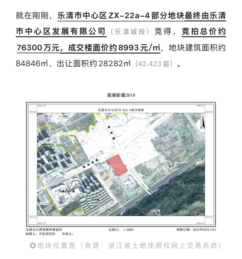 可是猫腻就在该地块早在2023年9月19日就已经上架挂牌,规划是建住宅,出让面积28282m²(约42.42亩)。而且同年10月20日,该地块由乐清市中心区发展有限公司竞得,成交价为76300万元,楼面价约为8993元/m² 。