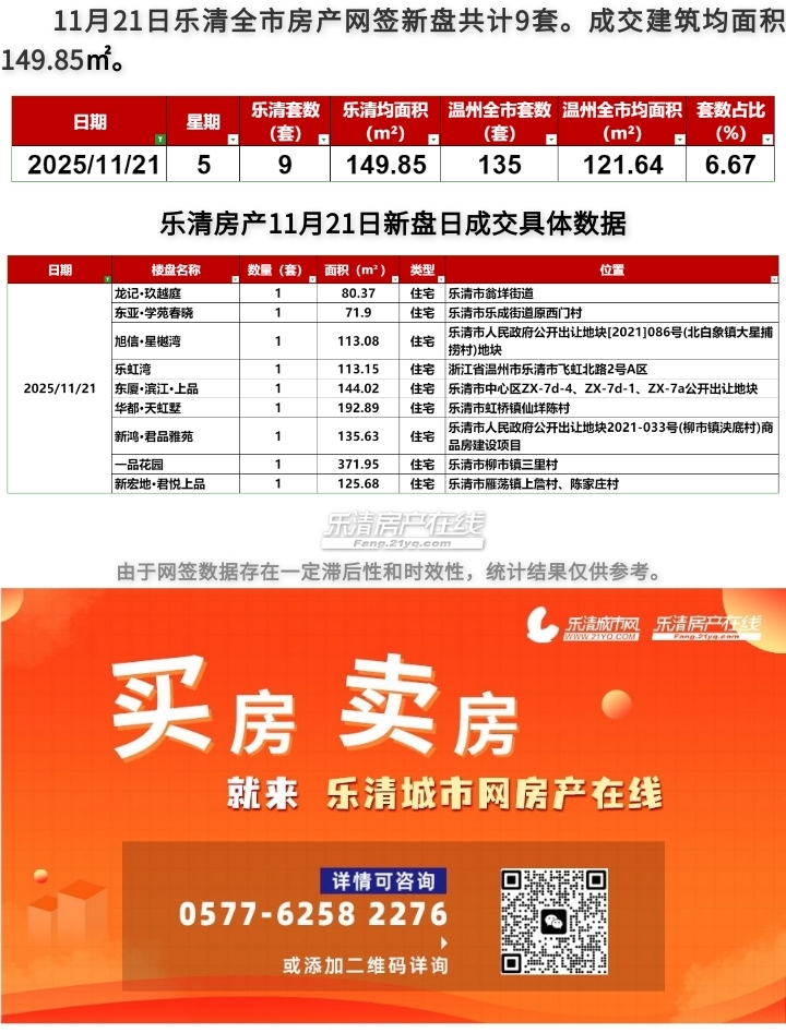 2025年11月21日乐清房产日成交量