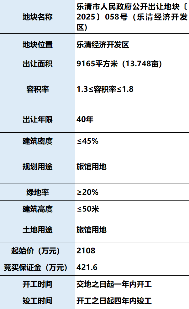 乐清市人民政府〔2025〕058号(乐清经济开发区)地块出让成功,出让面积为9165平方米(13.748亩),土地用途为旅馆用地。成交价2508万元,溢价率为23.72%,经过11轮的竞拍,由乐清经济开发区投资发展有限公司竞得。