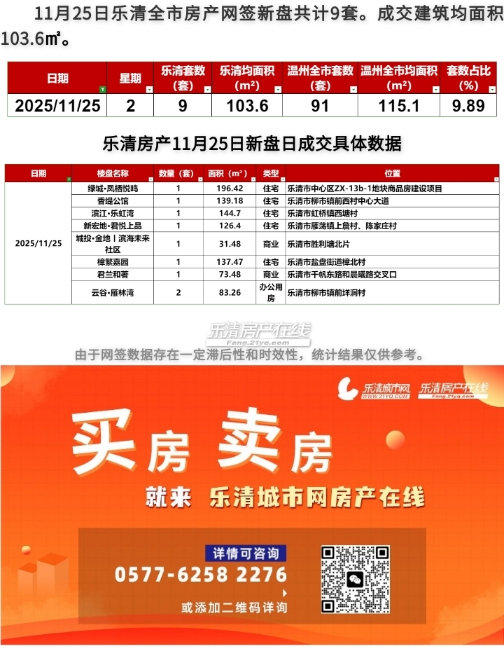 2025年11月25日乐清房产日成交量