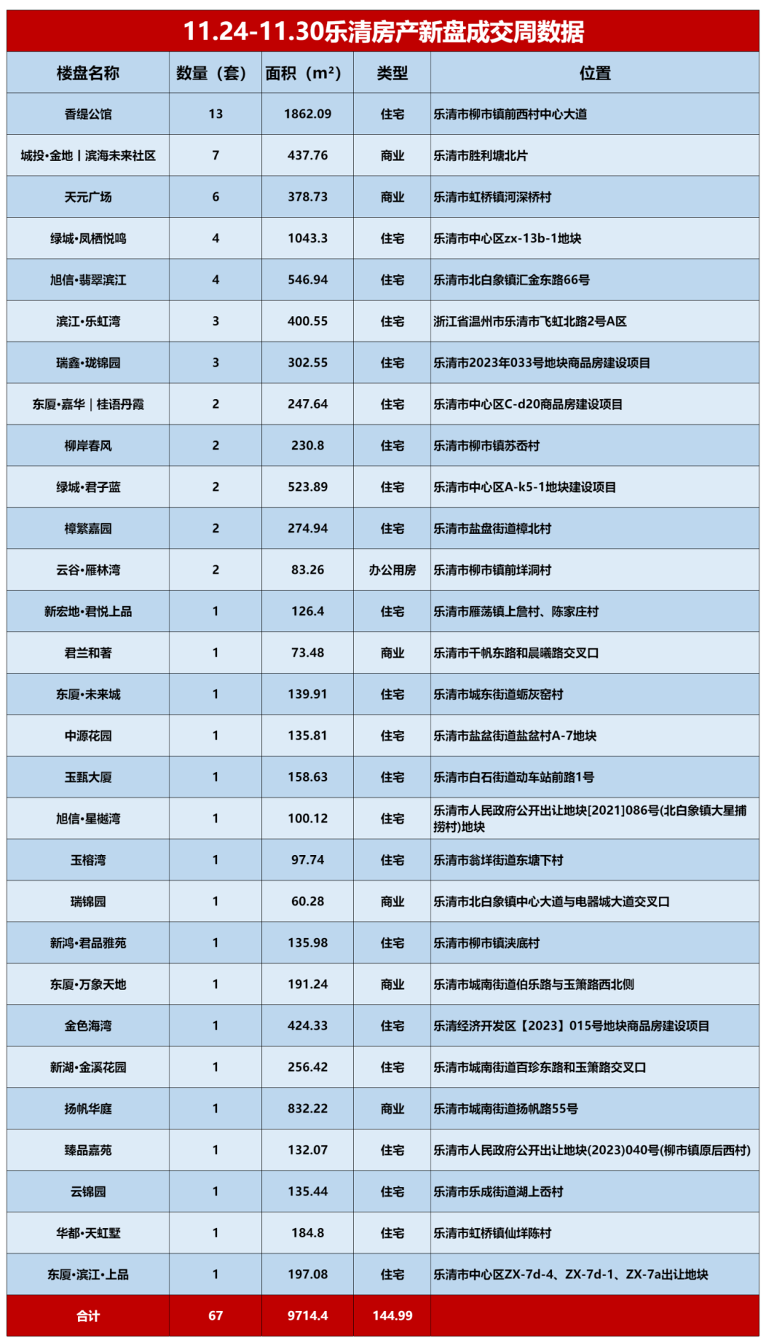 上周(11月24日—11月30日)乐清房产网签共计成交67套房源,成交面积约9714.4㎡。
