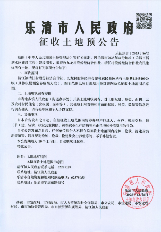 因乐清市2025年44号地块(乐清市新塘水闸建设工程)建设需要,拟征收九龙村股份经济合作社、清江村股份经济合作社农民集体所有土地,现将有关事项公告如下: