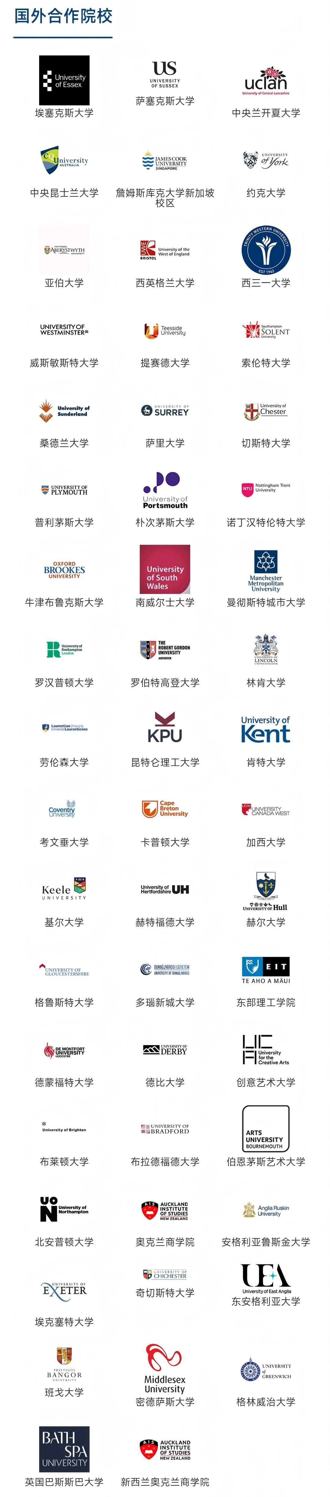 ◇ 国外主要院校:英国萨里大学、东安格利亚大学、埃塞克斯大学、班戈大学、赫尔大学、密德萨斯大学、德蒙福特大学、肯特大学、基尔大学、林肯大学、创意艺术大学、中央兰开夏大学、格林威治大学等;澳大利亚中央昆士兰大学;詹姆斯库克大学新加坡分校;匈牙利多瑙新城大学等50多著名学府。