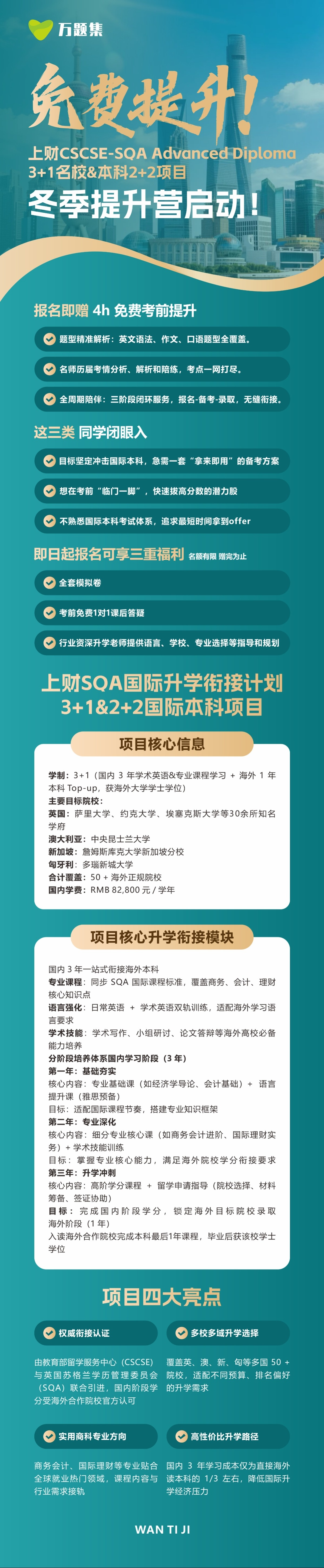◇ 适合人群: 适合高考成绩未达目标院校线,但英语基础尚可、希望出国获得本科学位的学生。项目为学生提供了在国内缓冲和适应国外教学模式的机会,降低了直接出国留学的风险。