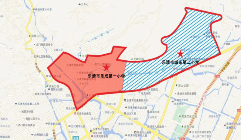 南大街以东;东大街以南;宁康东路以北;学子路以西,沿鲤鱼山脊延伸,向西接东塔公园东侧与环城东路交界处。其中蓝色区域为乐成第一小学和城东第二小学的双施教区。