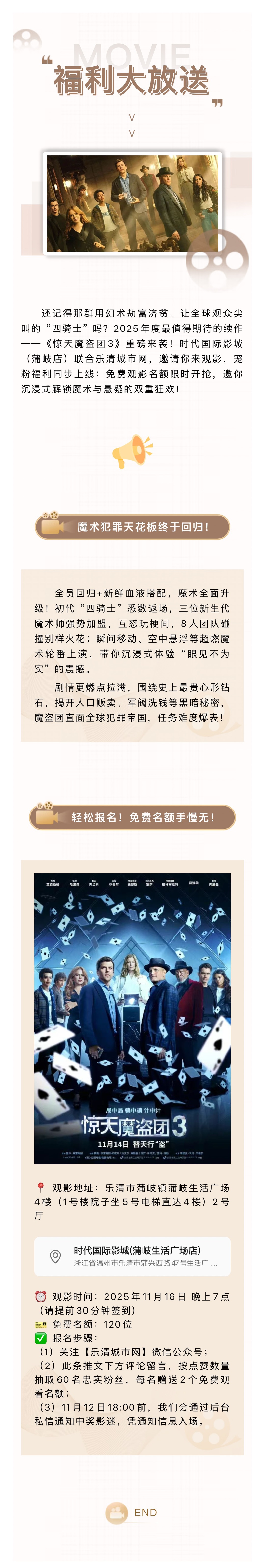 乐清影迷速来!免费邀你看大片《惊天魔盗团3》!