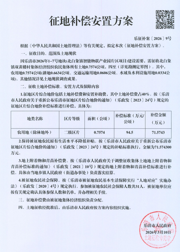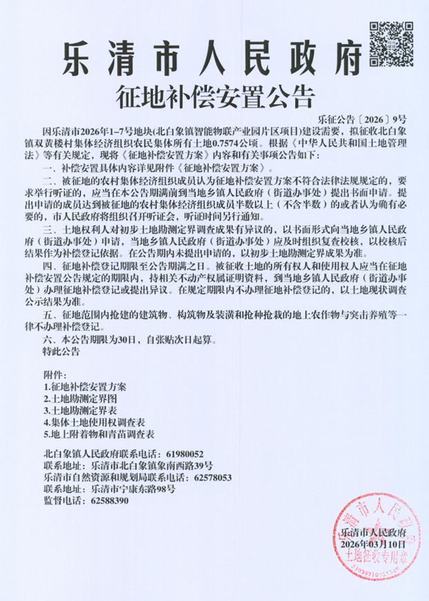 因乐清市2026年1-7号地块(北白象镇智能物联产业园片区项目)建设需要,拟征收北白象镇双黄楼村集体经济组织农民集体所有土地0.7574公顷。根据《中华人民共和国土地管理法》等有关规定,现将《征地补偿安置方案》内容和有关事项公告如下: