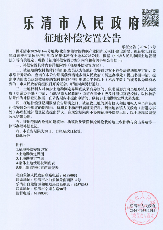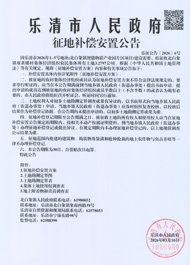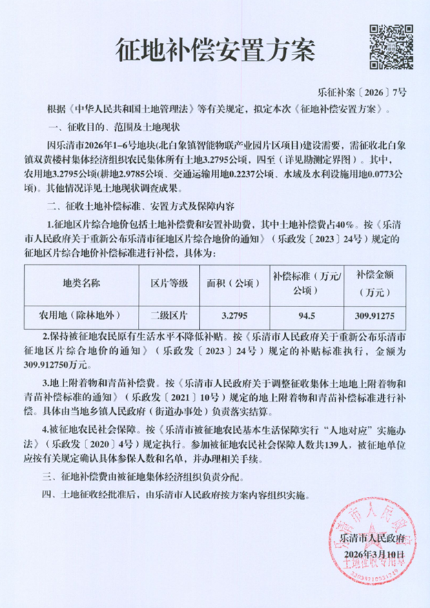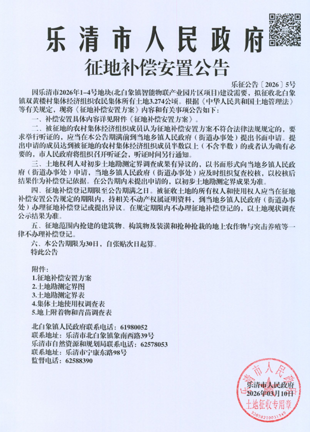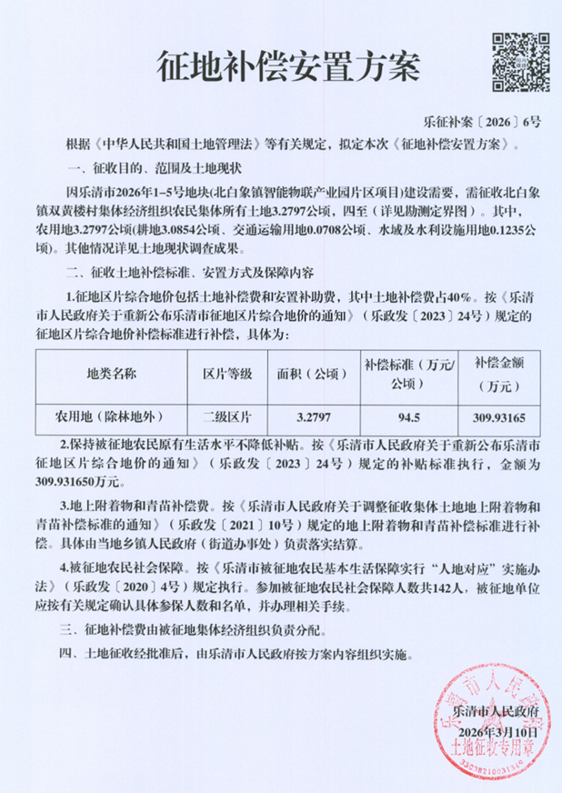 因乐清市2026年1-6号地块(北白象镇智能物联产业园片区项目)建设需要,拟征收北白象镇双黄楼村集体经济组织农民集体所有土地3.2795公顷。根据《中华人民共和国土地管理法》等有关规定,现将《征地补偿安置方案》内容和有关事项公告如下: