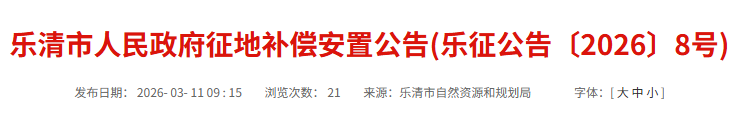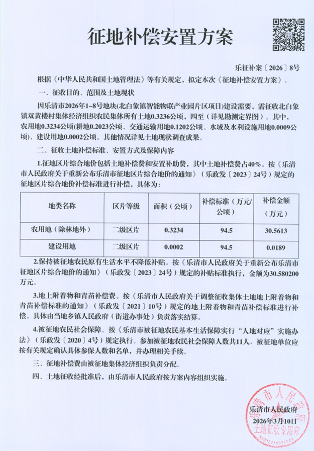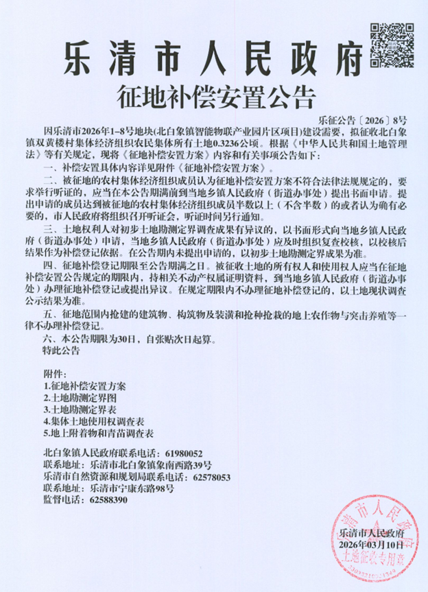 因乐清市2026年1-8号地块(北白象镇智能物联产业园片区项目)建设需要,拟征收北白象镇双黄楼村集体经济组织农民集体所有土地0.3236公顷。根据《中华人民共和国土地管理法》等有关规定,现将《征地补偿安置方案》内容和有关事项公告如下: