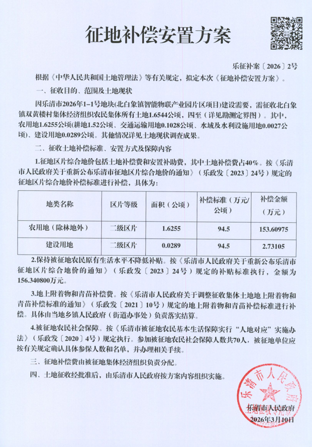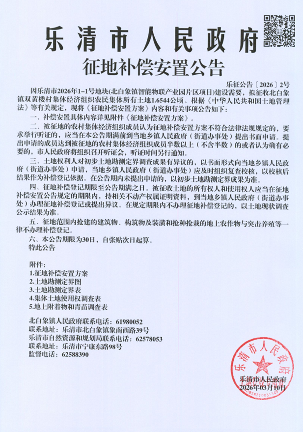因乐清市2026年1-1号地块(北白象镇智能物联产业园片区项目)建设需要,拟征收北白象镇双黄楼村集体经济组织农民集体所有土地1.6544公顷。根据《中华人民共和国土地管理法》等有关规定,现将《征地补偿安置方案》内容和有关事项公告如下: