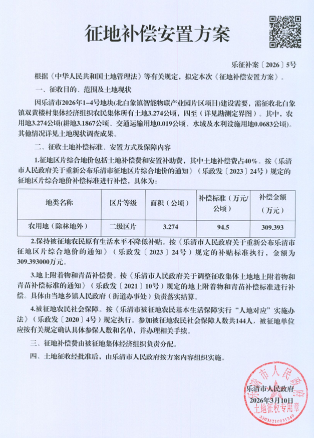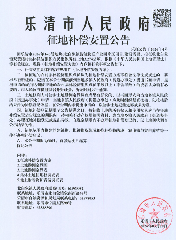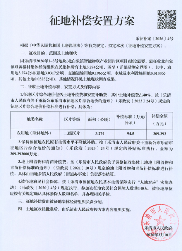 因乐清市2026年1-4号地块(北白象镇智能物联产业园片区项目)建设需要,拟征收北白象镇双黄楼村集体经济组织农民集体所有土地3.274公顷。根据《中华人民共和国土地管理法》等有关规定,现将《征地补偿安置方案》内容和有关事项公告如下: