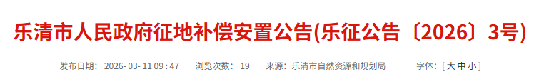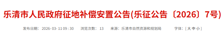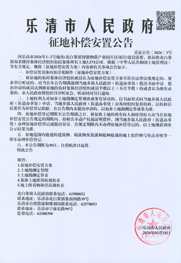 因乐清市2026年1-3号地块(北白象镇智能物联产业园片区项目)建设需要,拟征收北白象镇双黄楼村集体经济组织农民集体所有土地3.274公顷。根据《中华人民共和国土地管理法》等有关规定,现将《征地补偿安置方案》内容和有关事项公告如下: