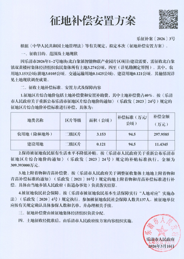 因乐清市2026年1-2号地块(北白象镇智能物联产业园片区项目)建设需要,拟征收北白象镇双黄楼村集体经济组织农民集体所有土地3.274公顷。根据《中华人民共和国土地管理法》等有关规定,现将《征地补偿安置方案》内容和有关事项公告如下: