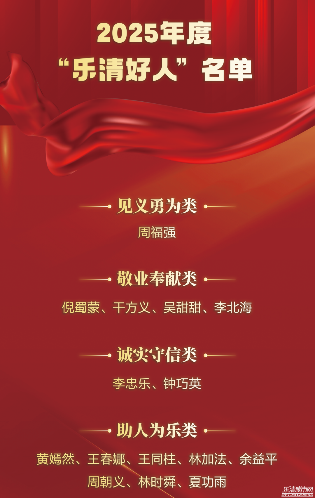 2025年度“乐清好人”名单揭晓,全市共评选出15名先进典型。我镇干方义、夏功雨、吴甜甜(吴韦瑶)三位同志光荣入选,用平凡善举彰显道德力量,为清江镇精神文明建设增添了温暖亮色。 ...
