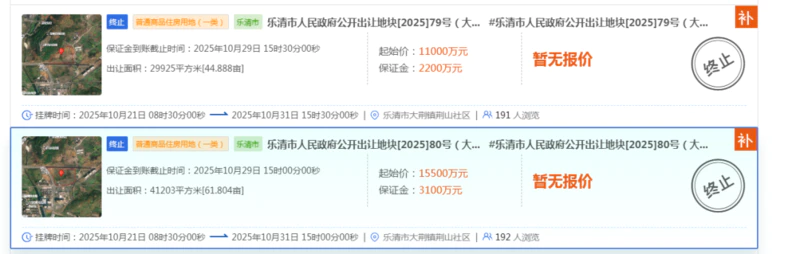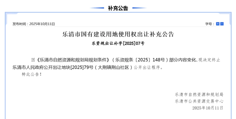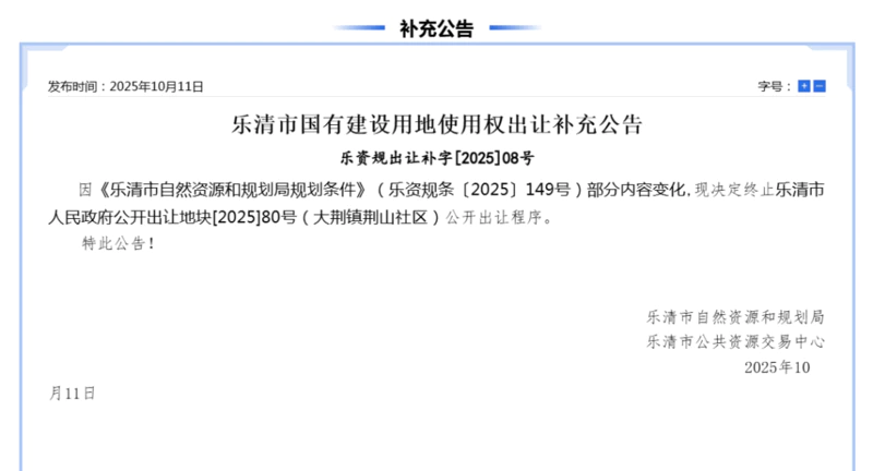 10月11日官方发布了乐清市人民政府公开出让地块[2025]79号、80号(大荆镇荆山社区),乐清市国有建设用地使用权出让补充公告,终止了两个地块的交易。