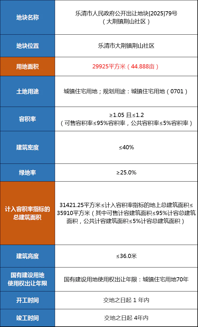 乐清市人民政府公开出让地块[2025]79号(大荆镇荆山社区)挂牌出让,地块位于乐清市大荆镇荆山社区,出让面积为29925平方米(44.888亩),土地主用途为普通商品住房用地(一类),竞地起始价11000万元,竞买保证金为2200万元,竞地价增价幅度为100万元,折合楼面价4798.3元/㎡